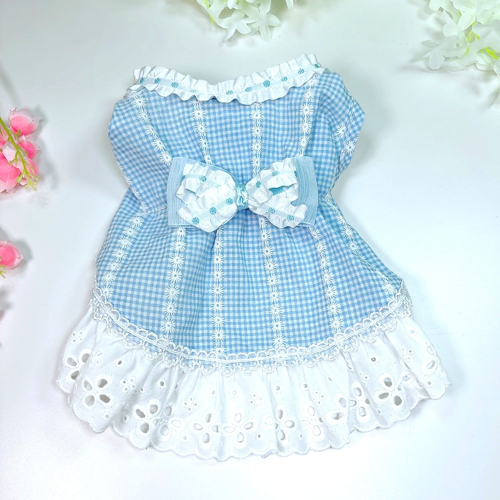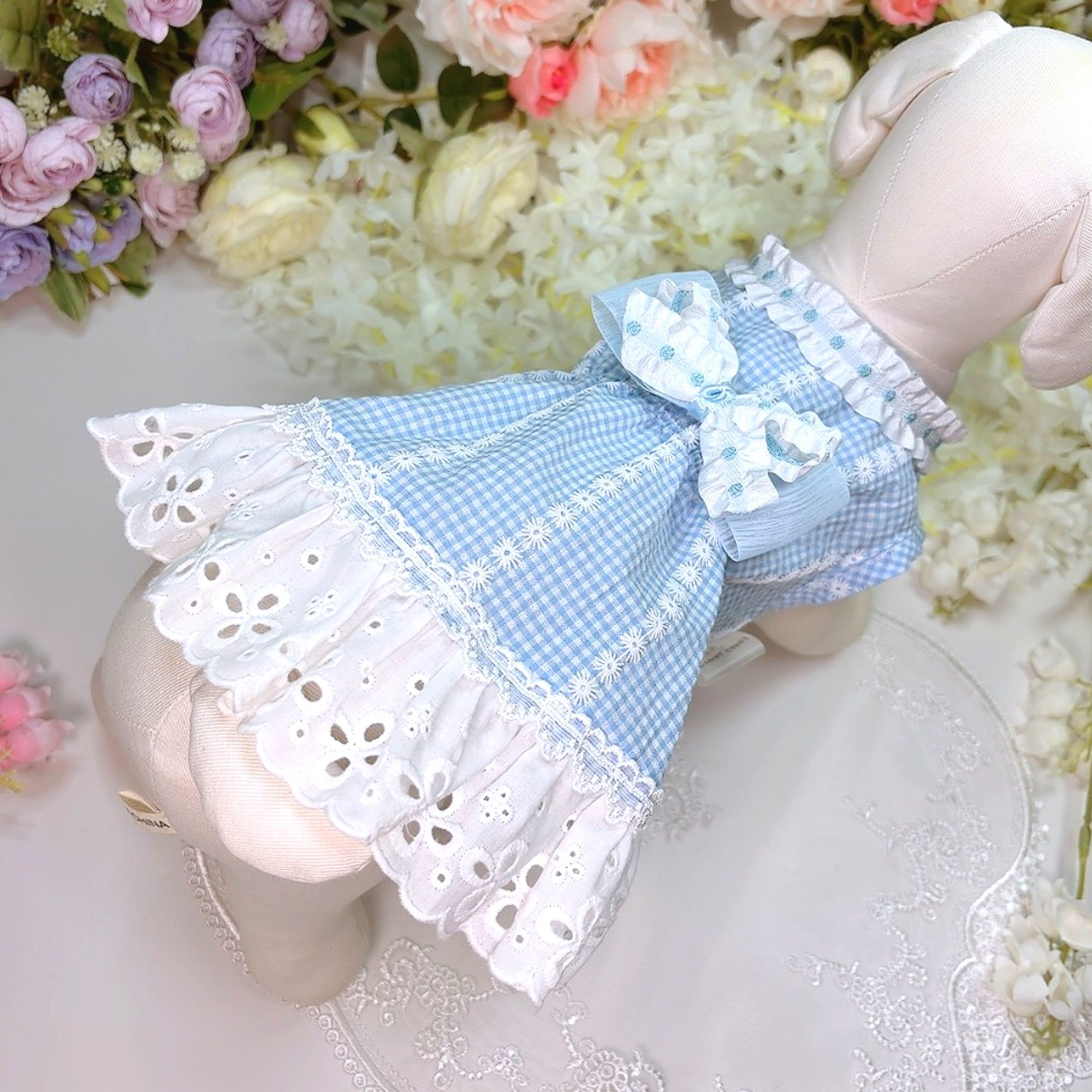 고급스런 블루고방체크에 하얀 플라워 프린트 드레스 ♥