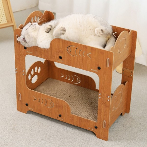 넉넉한 공간에서 편안 휴식이 가능하며, 튼튼한 내구성의 원목 하우스 형식으로 제작되어 아이들의 편안하고 즐거운 스트레소 해소를 도와주는 어몽드 핏베드 스크래쳐 하우스.