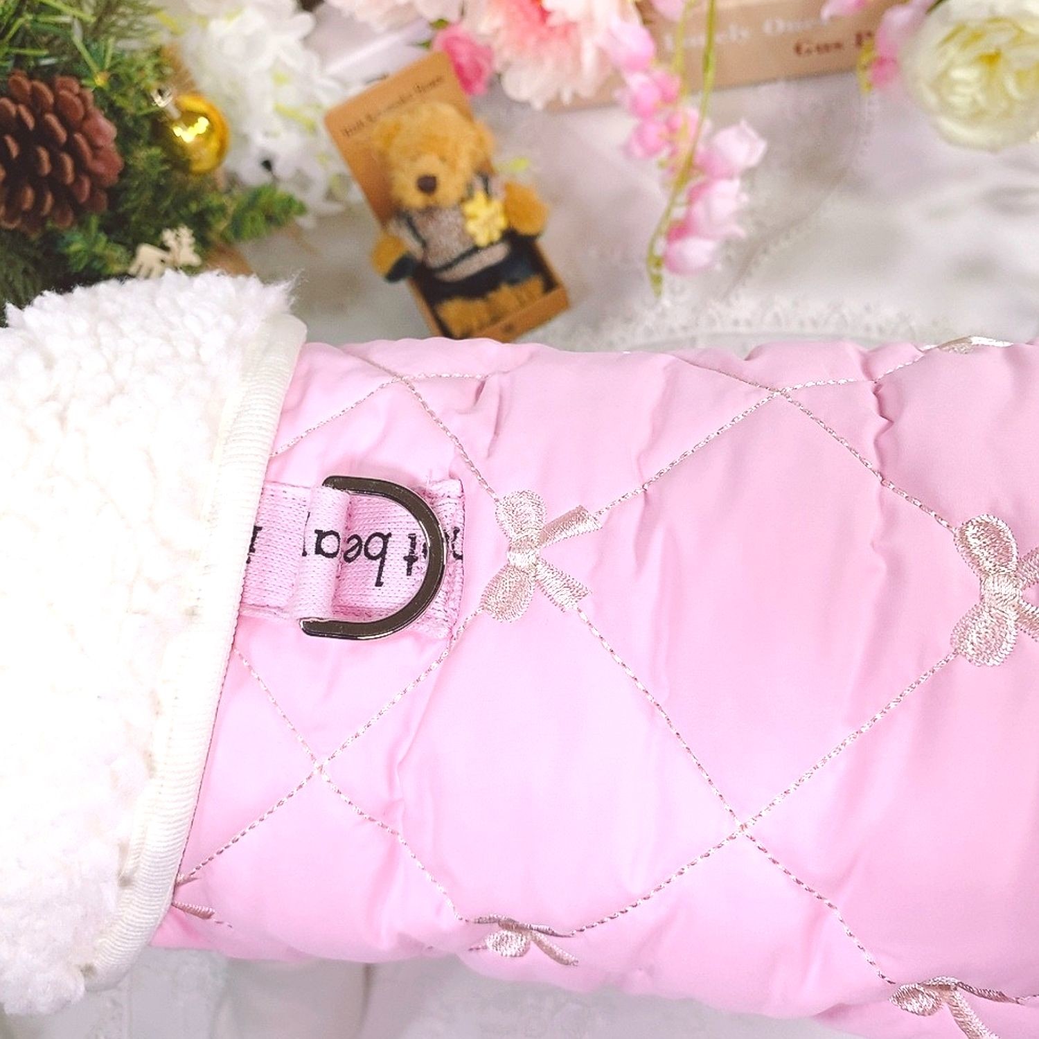 무광 핑크컬러 리본자수가 놓여져 있고