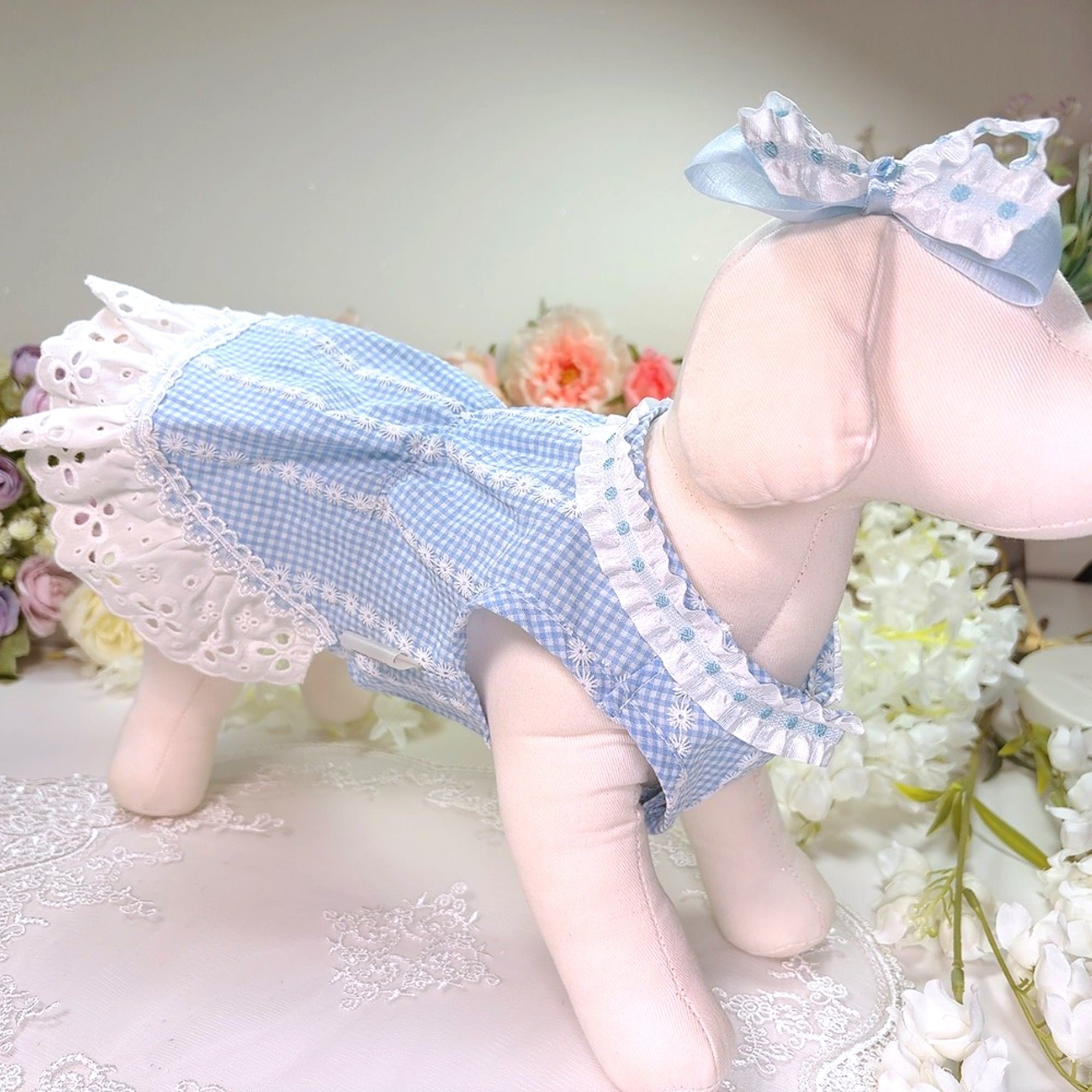 고급스런 블루고방체크에 하얀 플라워 프린트 드레스 ♥