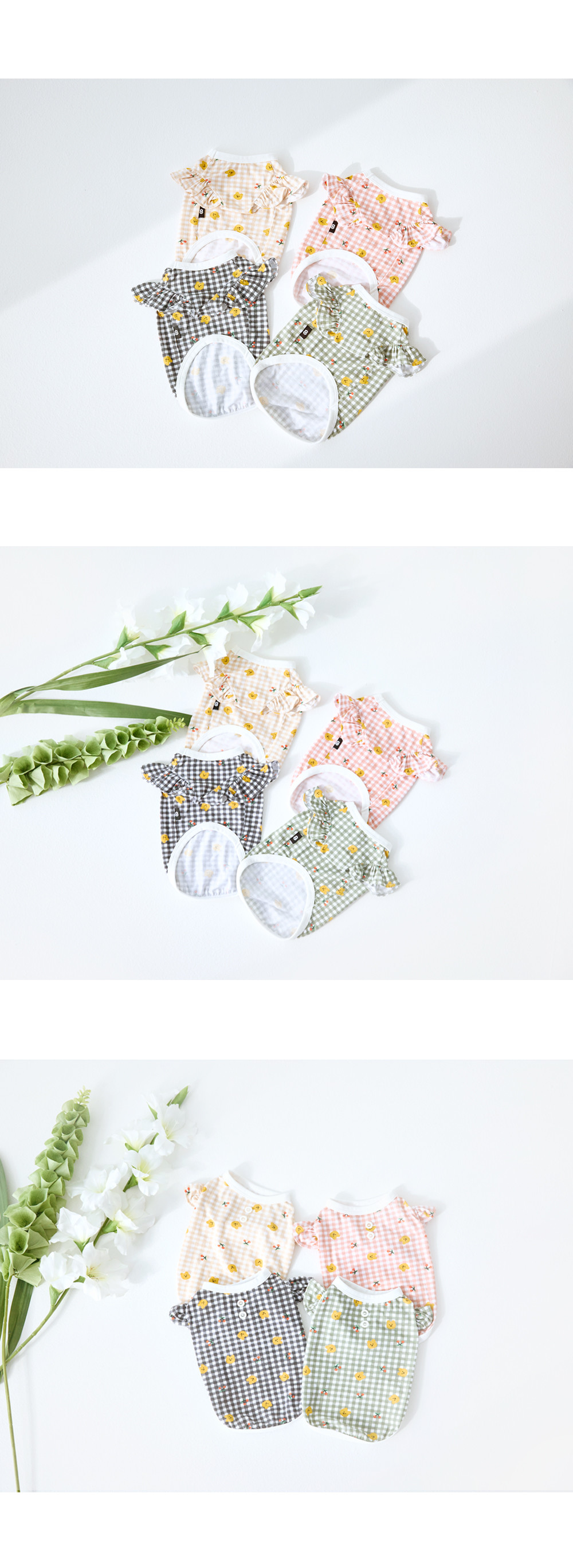 밋밋할 수 있는 기본 실내복을 프릴 소매와 등의 단추 장식이 꾸며주어 한층 아이의 귀여움을 살려줍니다.