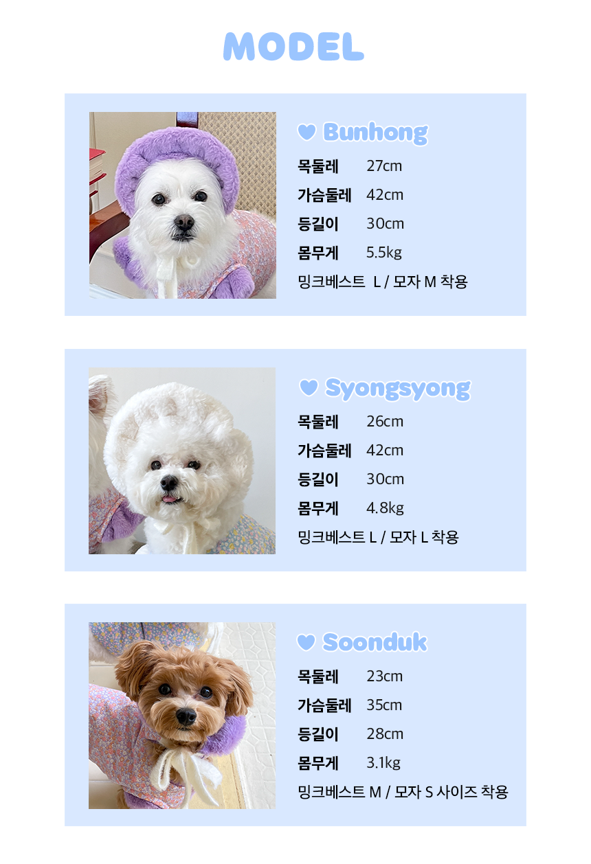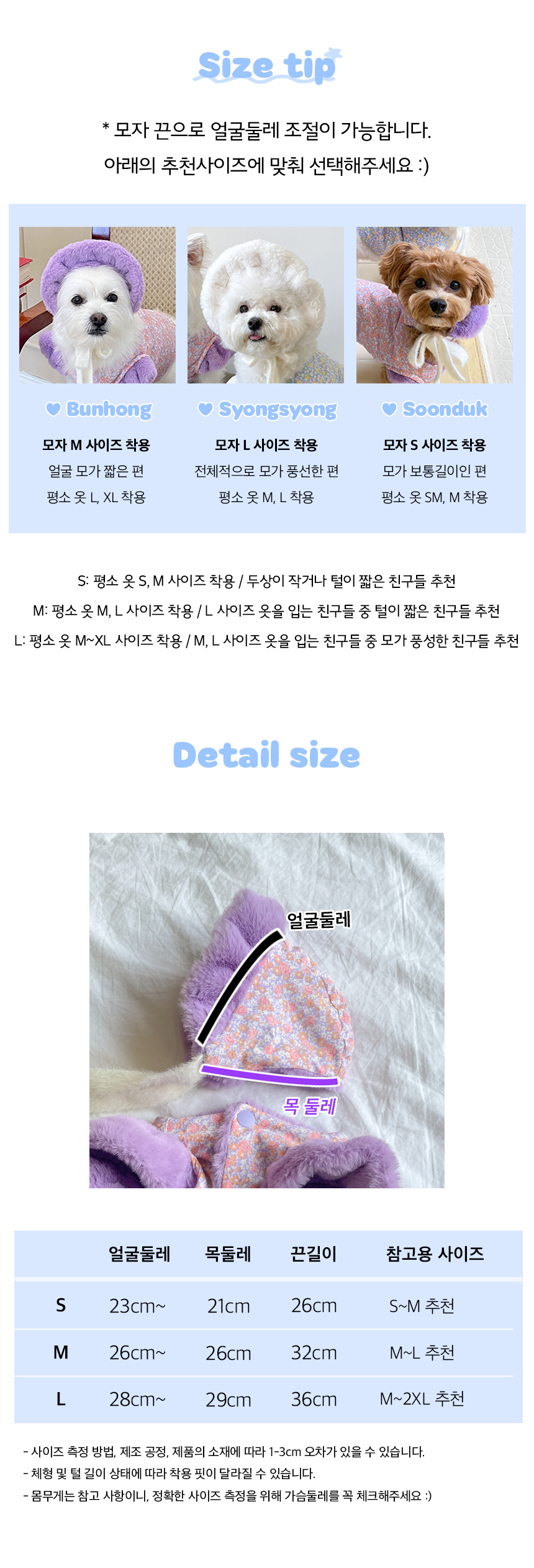 모자 M - M, L 사이즈 옷을 착용하는 친구들 / L 사이즈 옷을 입는 친구들 중 털이 짧은 친구들 추천